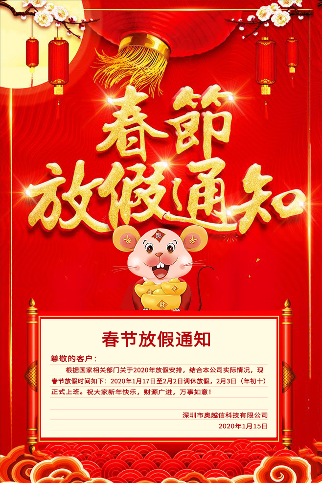 春節(jié)放假通知 2020年1月15日 16:31 公司動(dòng)態(tài) 奧越信科技全體員工祝:大家新年快樂(lè),財(cái)源廣進(jìn),萬(wàn)事如意!春節(jié)放假時(shí)間如下:2020年1月17日至2月2日調(diào)休放假,2月3日(年初十)正式上班。 « 2019年奧越信智慧農(nóng)業(yè)展會(huì)推廣回顧 喜訊!熱烈祝賀我司獲得“國(guó)家高新技術(shù)企業(yè)證書(shū)” »