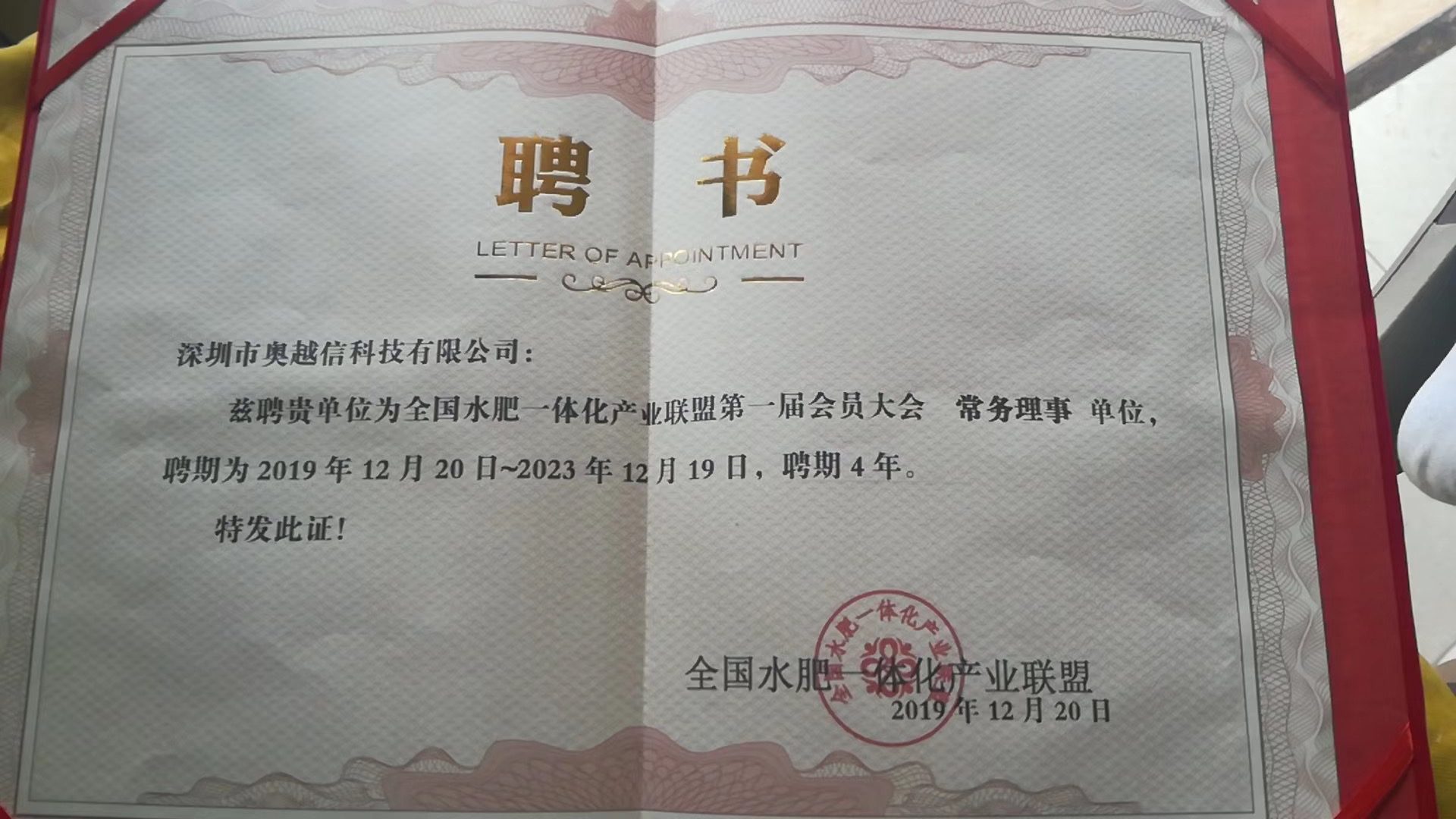 熱烈祝賀我司成為全國水肥一體化產(chǎn)業(yè)聯(lián)盟常務(wù)理事 2019年12月20日 20:34 公司動態(tài) 熱烈祝賀深圳市奧越信科技成為全國水肥一體化產(chǎn)業(yè)聯(lián)盟常務(wù)理事 « 奧越信公司圓滿結(jié)束“2019廣州國際物聯(lián)網(wǎng)展覽會” 2019年奧越信智慧農(nóng)業(yè)展會推廣回顧 »