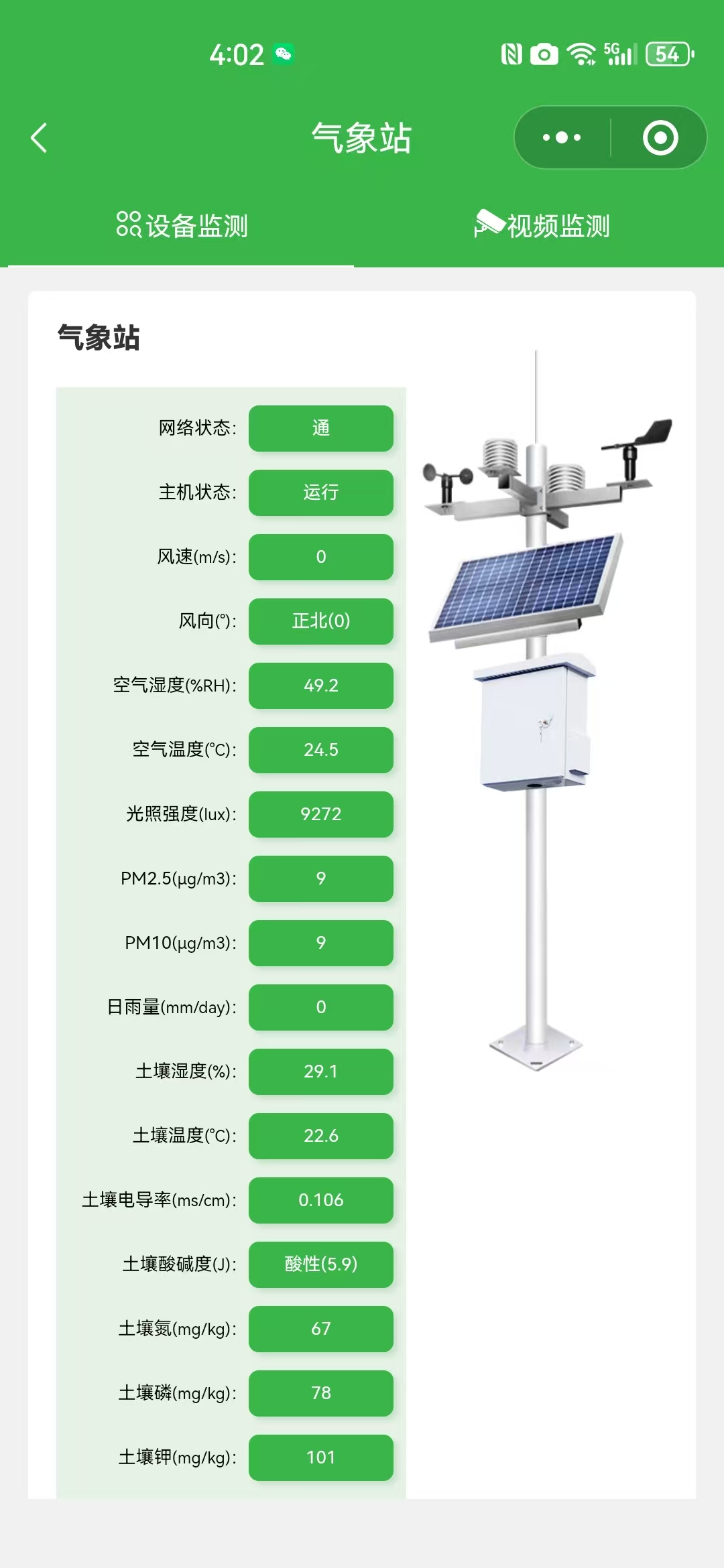 - 園區(qū)內(nèi)每50畝設(shè)置1臺(tái)?多參數(shù)室外氣象站?,實(shí)時(shí)采集風(fēng)速、降雨量、光照強(qiáng)度、空氣溫濕度、霜凍指數(shù)等10項(xiàng)數(shù)據(jù),每10分鐘上傳至云端平臺(tái)。