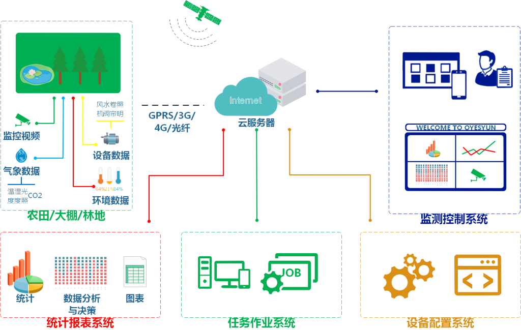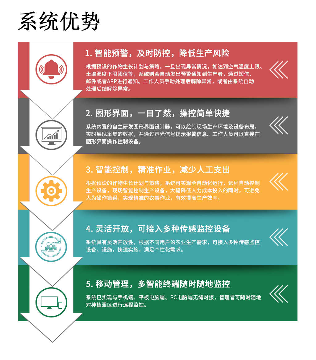 智慧農(nóng)業(yè)云平臺(tái)可遠(yuǎn)程獲取現(xiàn)場(chǎng)環(huán)境(如溫室大棚、稻田)的空氣溫濕度、土壤水分溫度、二氧化碳濃度、光照強(qiáng)度及視頻圖像,通過(guò)數(shù)據(jù)模型分析,可以自動(dòng)控制溫室濕簾風(fēng)機(jī)、噴淋滴灌、內(nèi)外遮陽(yáng)、頂窗側(cè)窗、加溫補(bǔ)光等設(shè)備;同時(shí),還可以通過(guò)手機(jī)、觸摸屏、計(jì)算機(jī)等信息終端向管理者推送實(shí)時(shí)監(jiān)測(cè)信息、報(bào)警信息,實(shí)現(xiàn)現(xiàn)場(chǎng)環(huán)境的信息化、智能化遠(yuǎn)程管理??蓽p少人工成本,實(shí)現(xiàn)無(wú)人值守,精準(zhǔn)調(diào)控,有效規(guī)避生產(chǎn)風(fēng)險(xiǎn)。